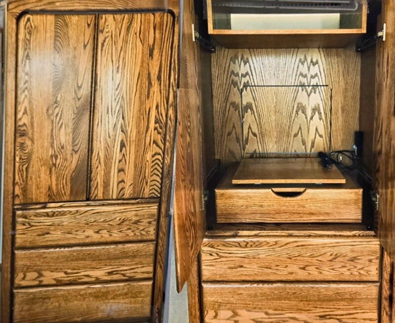 - A fine wood chest to hold a TV, plus three storage drawers below, shelf above and closing wood doors. A fine piece of furniture. Its 69" high and 36" wide. Make an offer by contacting Barb in #305.